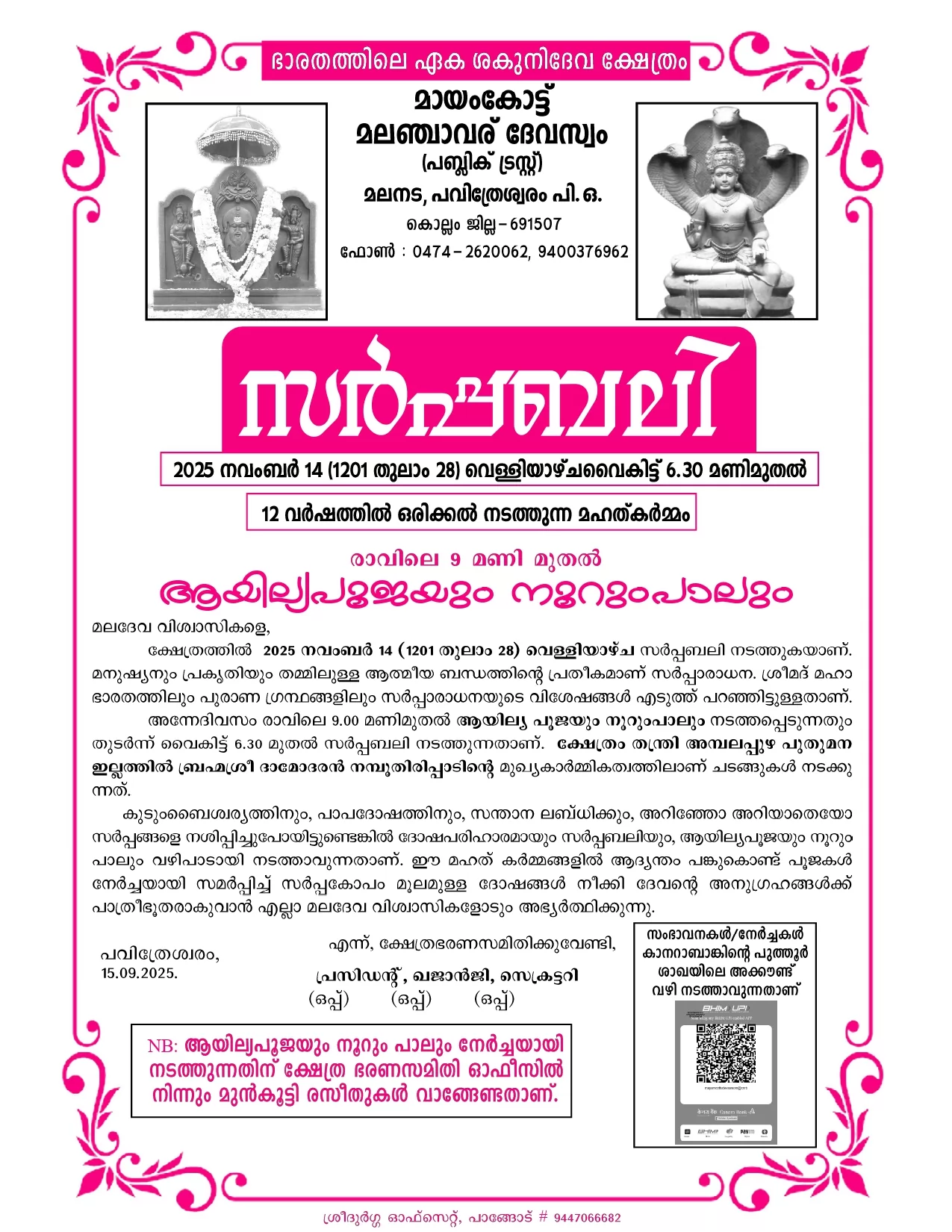 This is the unique temple having the recitation of Sreemad Mahabharatham for the last more than 75 years. Now on every first saturday of Malayalam month and having a Mahabharatha Yagnam for five days during the month of April- May every year.